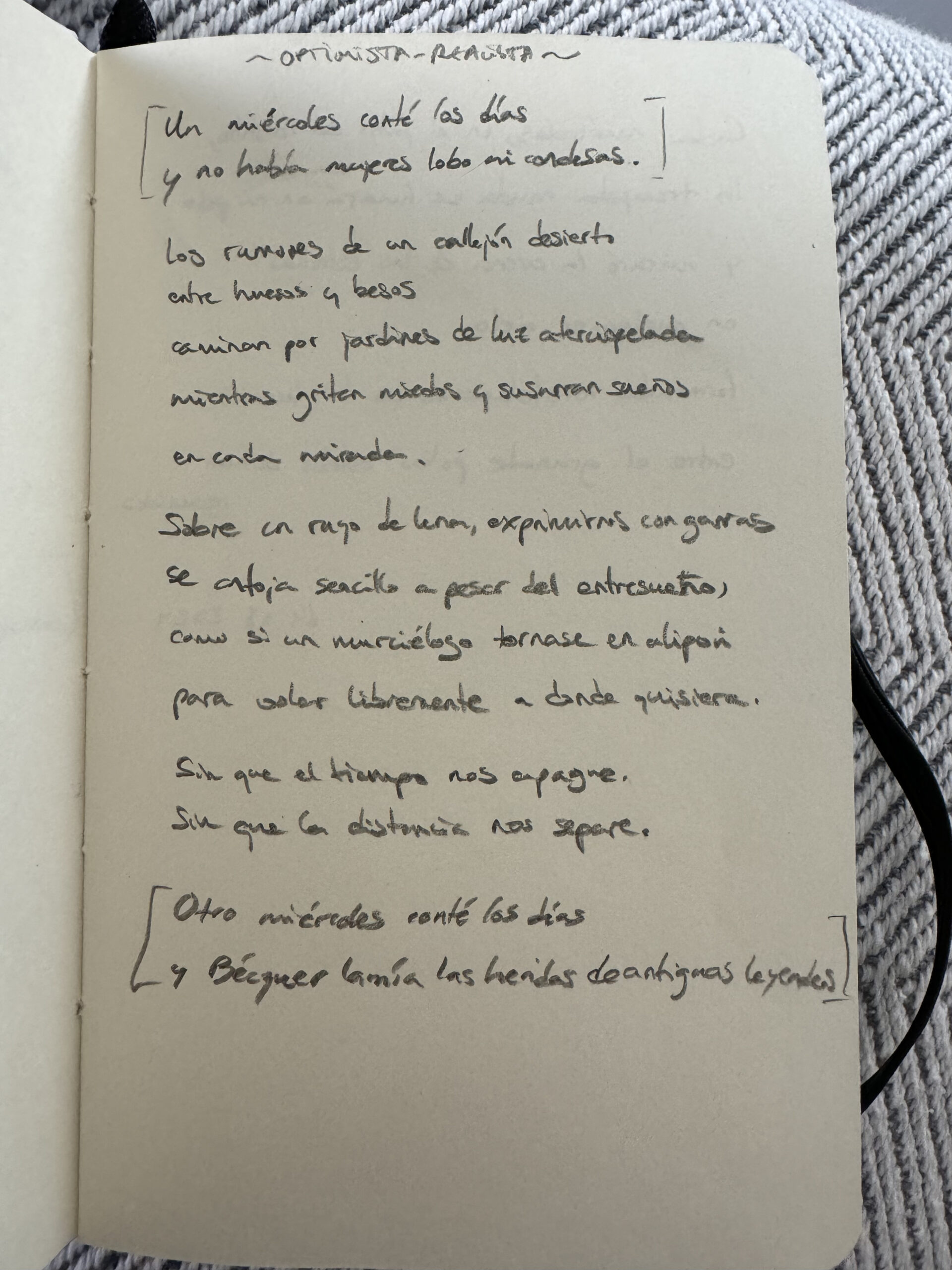 Escribí este poema a una persona, con la única indicación-petición de ponerle el título «Optimista-realista». Pensaba que era una invitación a expresar lo que me costaba decir en voz alta, así que lancé las palabras y les di forma en poco más de media hora. Supongo que me resultó fácil porque estaba deseando hacerlo. Siempre que tenemos ya las ideas encaminadas, resulta más sencillo moldear su figura.